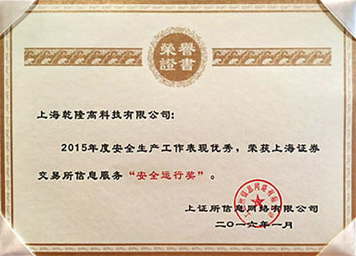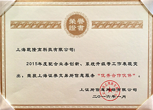 乾隆高科技有限公司因业务合作表现突出和安全生产表现优秀,荣获上证所信息网络有限公司颁发的2015年度"优秀合作伙伴"和"安全运行奖"!
