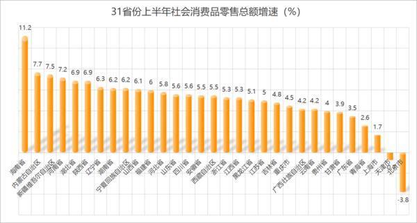 从31省份上半年社零增速排行榜来看,海南省上半年增速达到11.2%,位居全国第一名,并且远超其他省份。