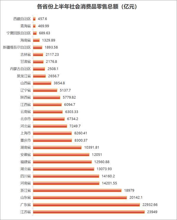 此外,有7个省份社零总额位于一万亿“俱乐部”,分别是浙江、河南、四川、湖北、福建、安徽与湖南;另有15地位于千亿“俱乐部”,分别是重庆、上海、河北、北京、云南、江西、陕西、辽宁、陕西、黑龙江、内蒙古、甘肃、吉林、新疆以及海南;宁夏、青海、西藏三地目前暂居百亿“俱乐部”,上半年社零总额分别达到:689.63亿元、469.99亿元、457.6亿元。